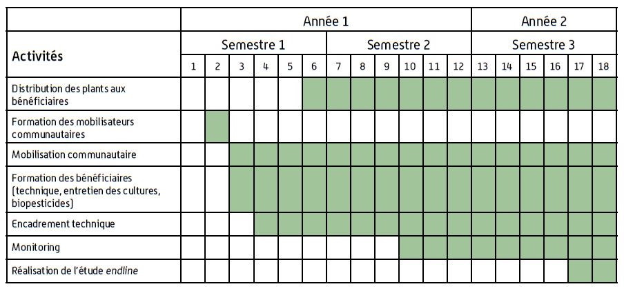 Nous appliquons le plan d'actions standard proposé par Solidarités International qui se base sur une durée optimale de 18 mois, ce qui permet de tester les sacs potagers sur plusieurs cycles de culture.